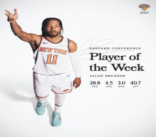 过去一周,布伦森场均28.8分4.5助攻,三分命中率40.7%,率领尼克斯取得4胜0负的佳绩。
