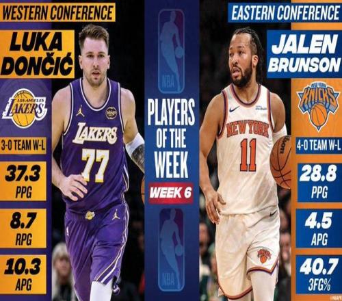 北京时间12月2日,NBA官方公布了第6周的周最佳球员。湖人球星东契奇当选西部周最佳球员,而东部周最佳的奖项属于尼克斯球星布伦森。这是东契奇生涯第15次当选周最佳,也是本赛季首次当选。这是布伦森生涯第8次当选周最佳,同样是本赛季首次当选。亚历山大、里夫斯等球星获得提名。