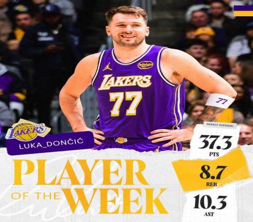 过去一周,东契奇场均37.3分8.7篮板10.3助攻,率领湖人取得3胜0负的佳绩。