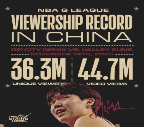 过去两场G联赛,杨瀚森场均有着14.5分11板3.5助1断2帽全面数据进账。据统计,北京时间11月15日杨瀚森G联赛首秀,即撕裂之城混音107-104山谷太阳比赛,创下G联赛在中国地区的收视纪录,总共吸引3630万独立观众(指去重后的观看人数),比赛视频总观看次数更是达到4470万。